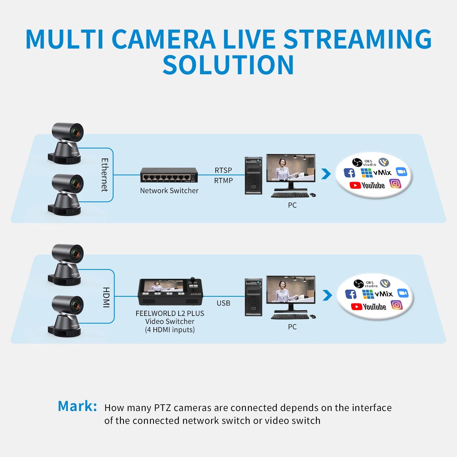 For medium or large live streaming always need multi cameras shooting to get different views. You can easy to connect multi PTZ cameras via network switch or video switcher.