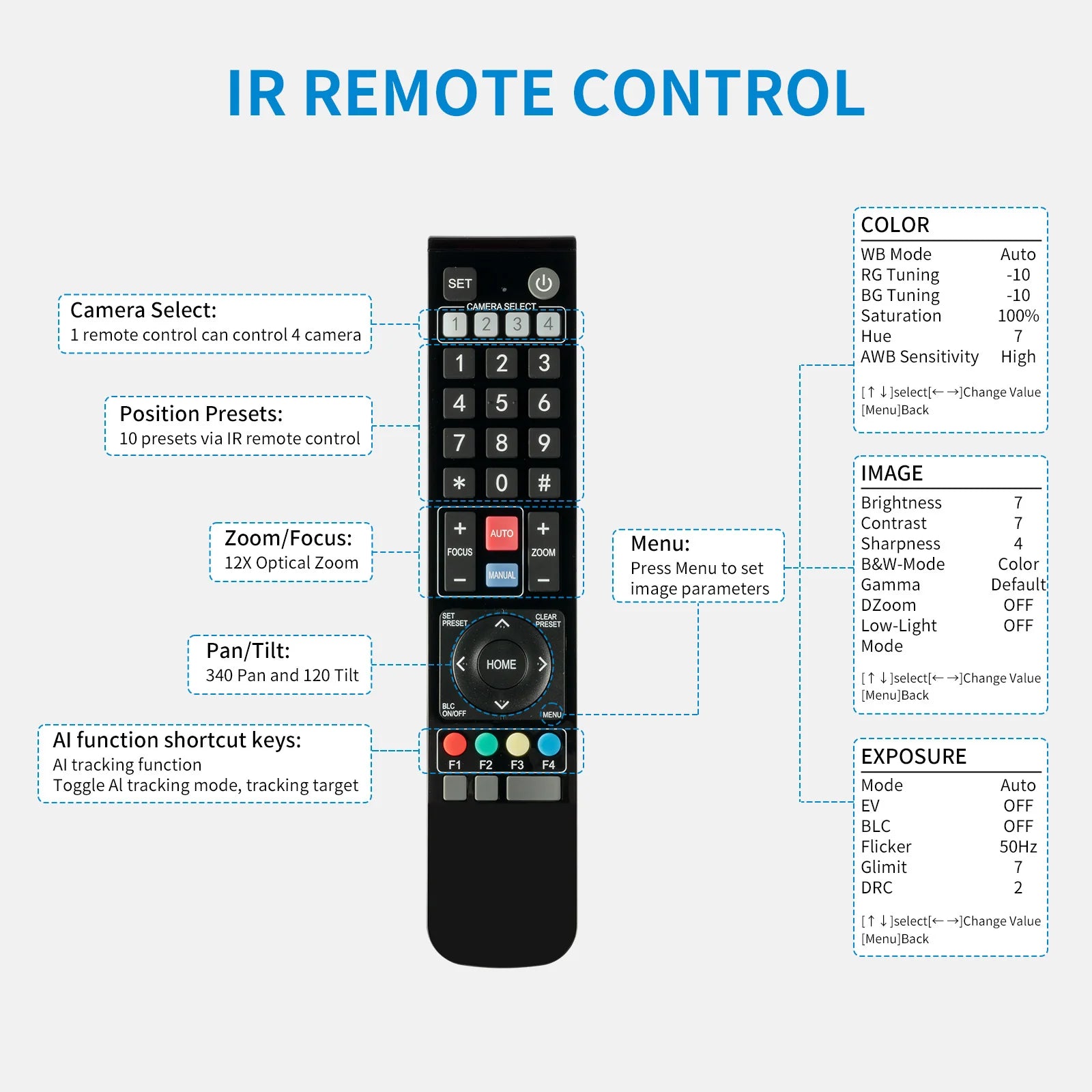 10 preset positions by IR remote controller, that can save pan, tilt, and zoom settings, and smoothly transition between them at the touch of a button. Up to 255 preset positions via network control or keyboard controller.