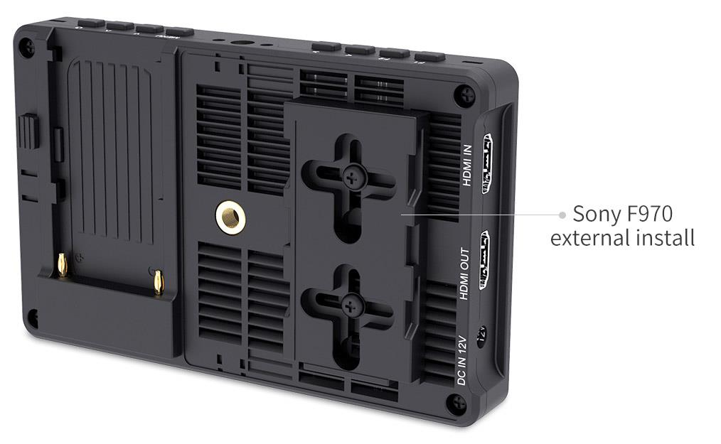 A Sony F970 external install and power kit design is added to the back of the monitor. The external kit can be used to install and install the external equipment, like a wireless transmitter, an LED light, a video converter, and others, which can be powered by a Sony F970 battery. This innovative external power supply design reduces the need for photographers to connect to external wireless transmission, LED light, and other equipment, greatly saving the space occupied by the equipment and reducing the weight of photography equipment.