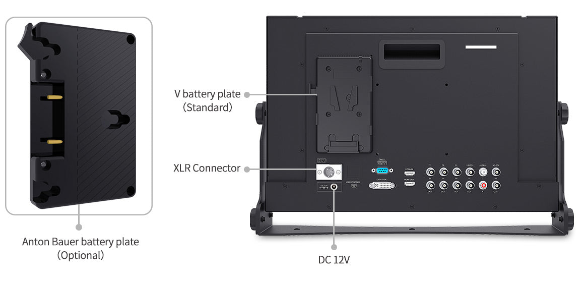 We've made it easy to power the monitor. P173-9HSD can be powered in two ways: with a DC adapter or lithium batteries. The P173-9HSD has a flexible battery system that supports a V battery plate (standard), an Anton Bauer battery plate of your choice.