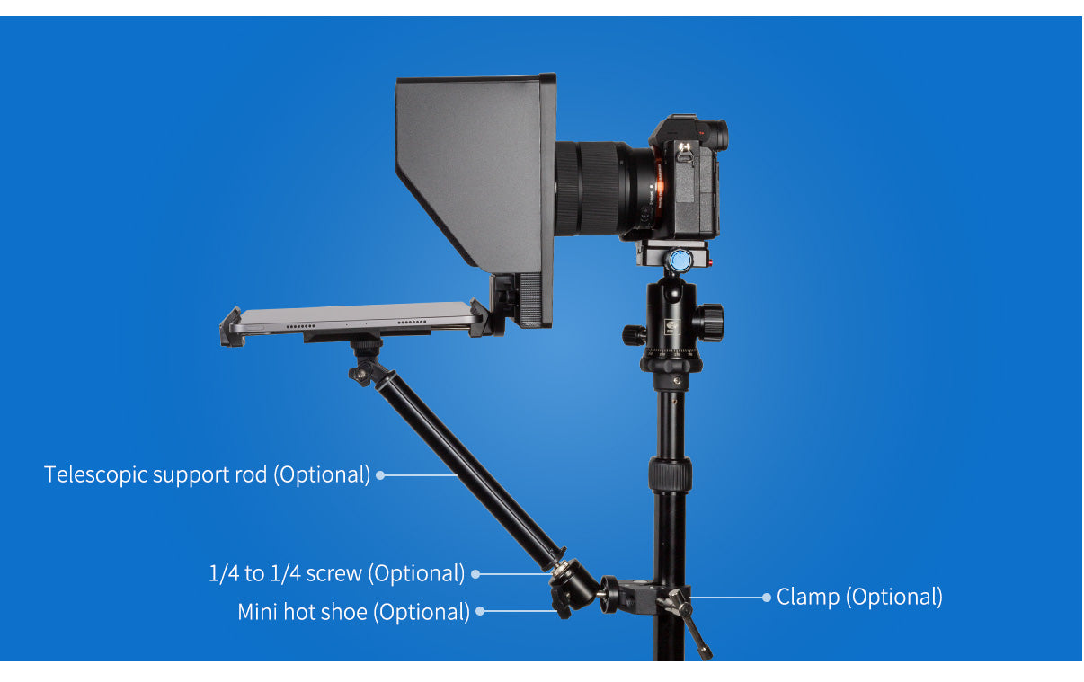 There are two 1/4” standard-size mounting threads on the top of the teleprompter and three 1/4” standard-size mounting threads on the bottom. The bottom ones can be connected to a tripod, light stand, etc., and the top one can be installed with a microphone, fill light, etc., to enrich your shooting.