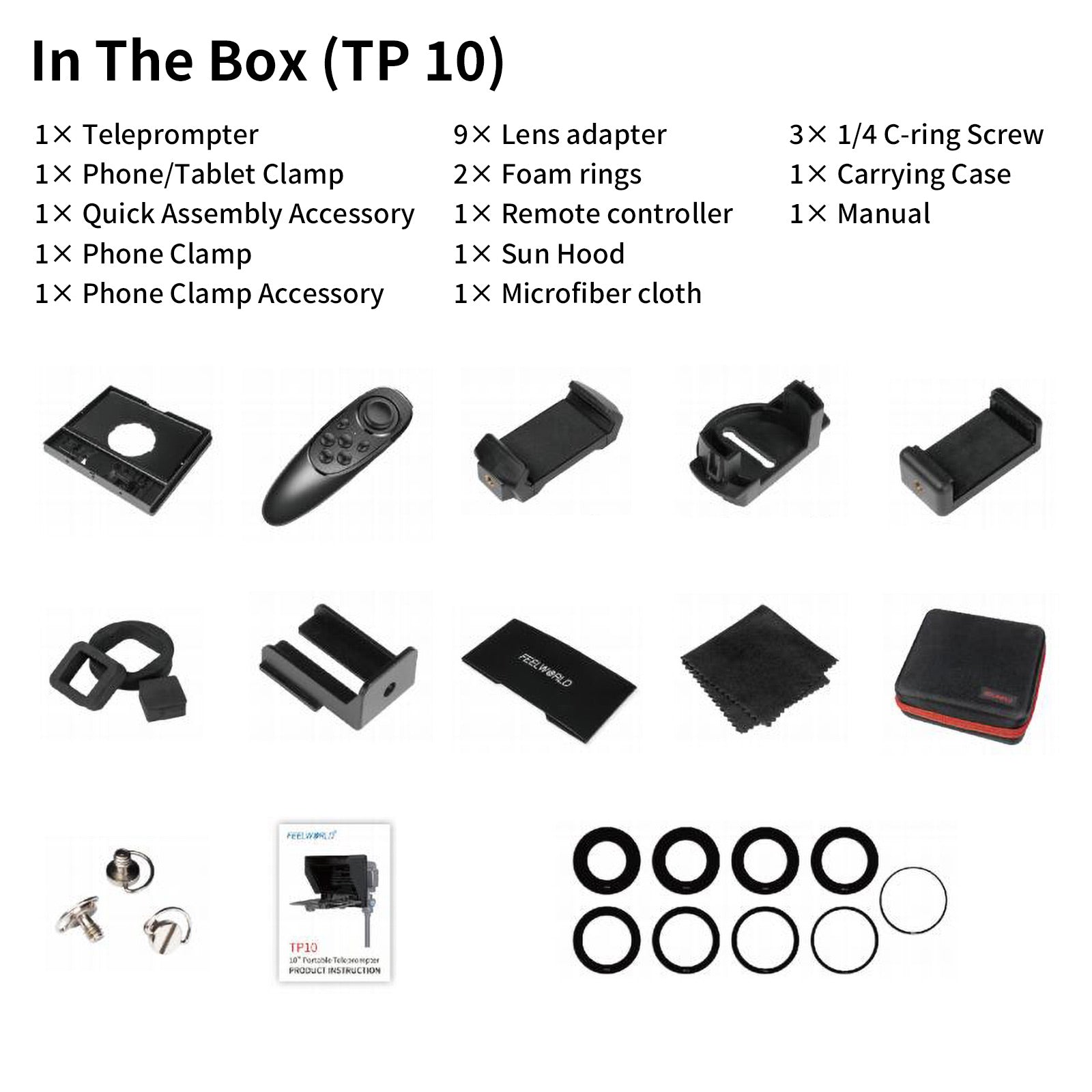 FEELWORLD TP10 is a folding and portable teleprompter that features a 10-inch standard beam splitter, allowing you to clearly read scrolling text while looking directly into the camera, perfect for vlog, live broadcast, online class, video recording, interviews, video studio, news, and presentations. No need to recite the script, confident and charming! It can be prompted via smartphone or tablet while a DSLR camera or phone is shooting. Supports a wide-angle lens, Android/iOS app, Bluetooth remote control, easy to operate, making the video production more efficient. Use with an exquisite special storage case, more convenient to carry. It is ideal for a video, program creator.
