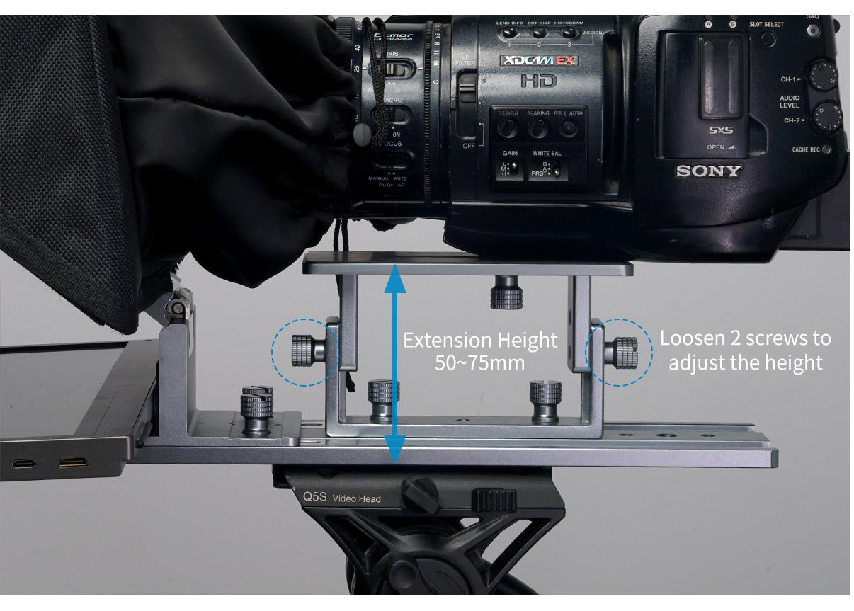 You can adjust the lens height of the shooting device via TP16‘s lifting mount to avoid the edge of the teleprompter and prompting device from entering the lens.